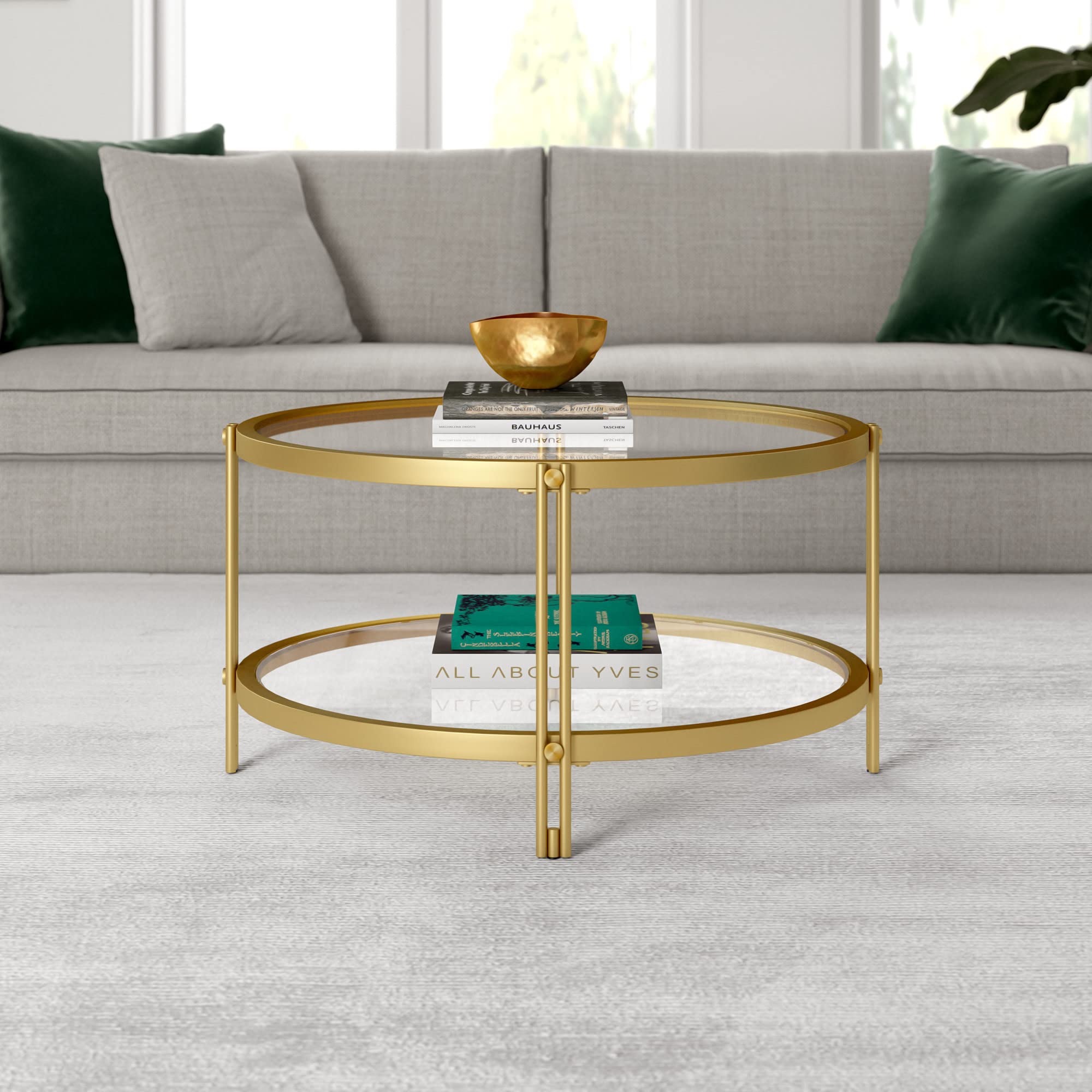 Amazon Com Inez 32 Wide Round Coffee Table With Glass Shelf In Brass Home Kitchen